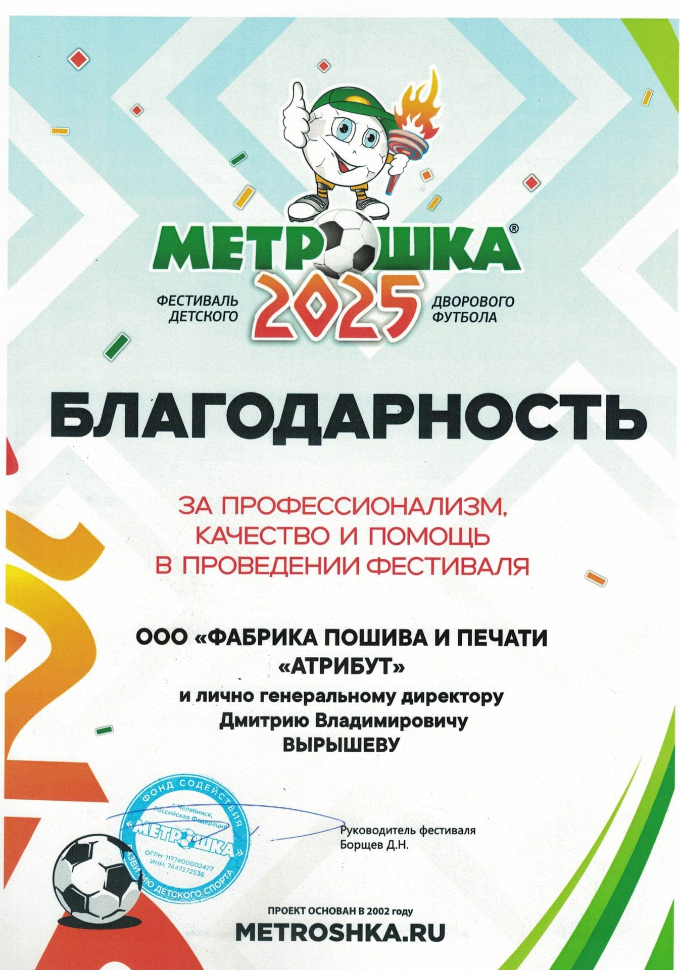 Выражаем искреннюю благодарность и признательность Фабрике пошива и печати "Атрибут" за длительное и плодотворное сотрудничество. Мы высоко ценим установившиеся между нами партнерские отношения и взаимопонимание. Хотим подчеркнуть высокий уровень профессионализма вашего персонала и поблагодарить за оперативность решения вопросов.